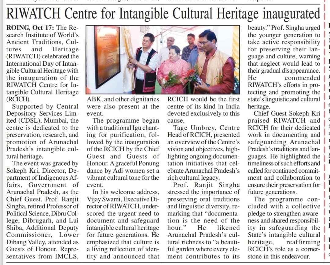 The Research Institute of World’s Ancient Traditions, Cultures and Heritage (RIWATCH) celebrated the International Day of Intangible Cultural Heritage with the inauguration of the RIWATCH Centre for Intangible Cultural Heritage (RCICH) at its campus in Roing.